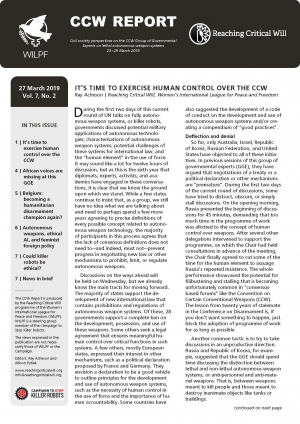 A few countries, including Austria, Canada, and Ireland, have raised concerns about this type of bias in autonomous weapon systems; it is a central concern of the Women’s International League for Peace and Freedom (WILPF) and some other members of the Campaign to Stop Killer Robots. WILPF is also concerned with some of the other destabilising effects that autonomous weapons would be likely to have on gender equality and gender-based violence, racial justice, and human rights more broadly. This is also why we believe diversity in these discussions is vital to preventing autonomous weapons, and we welcome the European Union’s call for gender diversity in CCW discussions. Broader participation of countries from the global south is also imperative, as WILPF Cameroon member Guy Blaise Feugap explains later in this edition of the CCW Report, as is the participation of those likely to experience repression and violence from the use of these weapons, such as people of colour, First Nations, human rights defenders, and environmental activists.
