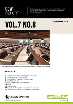 Following directly on the heels of a difficult round of disarmament discussions at the UN General Assembly First Committee in New York, the high contracting parties to the Convention on Certain Conventional Weapons (CCW) met in Geneva for their annual meeting to discuss a range of issues including fully autonomous weapons, the use of explosive weapons in populated areas, incendiary weapons, and mines other than anti-personnel mines. As at First Committee, there was a clash between those governments seeking to prevent humanitarian harm from weapons and those resisting any possible curtailment of the development or use of weapons. Since the CCW operates on the basis of consensus-as-unanimity, the handful of states objecting to regulations or restrictions were once again successful in obstructing further work on pretty much all of the CCW’s agenda items. The meeting adopted its final report by consensus, but the agreed outcomes are once again reflective of the lowest common denominator, not a progressive agenda for preventing human suffering from weapons and war.