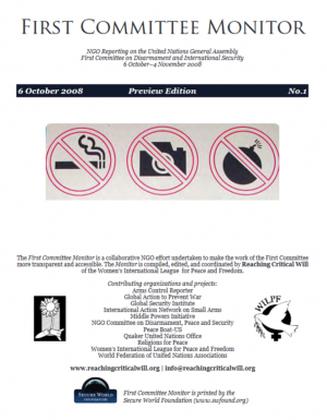 This session of the UNGA First Committee has an opportunity to build consensus, bridge gaps, and support the development international norms that can lead to effective disarmament and non-proliferation. In his opening statement on 16 September, General Assembly President H.E. Father Miguel dEscoto Brockmann, M.M. of Nicaragua noted, The General Assembly has a clear mandate to consider principles regarding disarmament and the regulation of armaments, as well as to make recommendations. Each year this body adopts over 50 resolutions and decisions on these issues. Yet something is missing from our deliberationsnamely, the effective implementation of our decisions by constructive action. He thus called upon member states during this sixty-third session to adopt a results-based approach both to disarmament and to the regulation of armaments, an approach that measures progress by deedsand not words or numbers of resolutions alone. Reaching Critical Will supports this call and urges all delegations to commit themselves to actions that will increase real peace, security, and justice. This preview edition of the First Committee Monitor highlights just a few of the areas where concerted action is necessary and possible, including the Comprehensive Test Ban Treaty, cluster munitions, and depleted uranium weapons.
