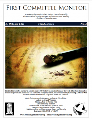 Multilateralism is at the core of the UN’s methods and ethic of work. As both nuclear and non-nuclear weapon states have pointed out repeatedly, disarmament and non-proliferation are not just the responsibility of those states that possess the weapons. They are the concern of the entire international community. Thus ensuring that each member state has the opportunity to participate in negotiations to develop collective security arrangements that enhance human security is imperative. This First Committee has the opportunity to make inroads to beginning substantive work on the issues the international community has deemed to be of the highest priority and the upcoming CCW Review Conference has the opportunity to preserve and support the successful product of multilateral negotiations that have already taken place. We sincerely hope these opportunities will not be squandered.