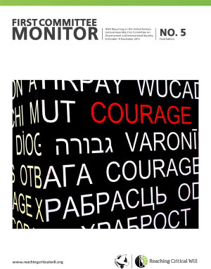 These are but a few examples of avenues that states and other stakeholders should discuss and pursue. There are many more. A range of ideas are presented by civil society coalitions and campaigns in the First Committee briefing book, available from Reaching Critical Will online and in hardcopy during the Committee’s meetings. The groups that have contributed to this book work on many different issues and weapon systems from a variety of perspectives, but they all share one thing in common: the desire for more effective, transparent, and inclusive diplomatic work at the United Nations. We believe that most delegates seek true progress and the enhancement of human security. We hope that our contributions will provide inspiration and alternatives as delegates engage in the important work ahead.