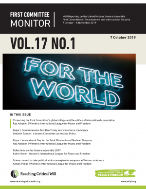 The UN General Assembly was designed as a place for the governments of all member states to have an equal say, and it is this spirit that we urge First Committee delegates to uphold in 2019. The activists, survivors, and public that look to the UN for progress and change urge all delegates to speak up for humanity. The resolutions and agreements reached in this Committee can have meaning: they have led to great things in the past and can again. Do not let a handful of heavily militarised governments shut you down. What needs to be shut down are arms factories and arms fairs, not international discourse about disarmament. At a time when the nuclear-armed states are ripping apart arms control treaties, when they are more interested in the profits of the arms trade instead of the well-being of people, the rest of the international community has a vital role to play in putting forward alternatives for our collective security—security based on the rule of law, disarmament, equity, justice, and peace.