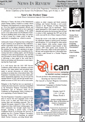 This first Preparatory Committee is supposed to be a place to discuss the most important issues of the review cycle, so states and NGOs focus on discussing ideas and circulating proposals. The Non Aligned Movement, chaired by Cuba, will be presenting more than a half dozen working papers. The NGO community has brought ample food for thought, including a launch today (1:30pm, Conference Room A) of Securing Our Survival, an updated case for a Nuclear Weapons Convention. Reaching Critical Will is launching an updated Model Nuclear Inventory, providing factual information on states' weapons and fissile materials holdings; and Nuclear Disorder, a civil society response to the Weapons of Mass Destruction Commission Report will be distributed. These inputs generated by NGO experts are intended to stimulate and nurture the discussions that will lead to action to fully implement the NPT and rid the world, once and for all, of these weapons of terror.