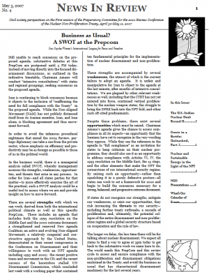 There are several strengths with which we can work, derived from both the international political climate as well as this specific PrepCom. These include: an agenda that includes both the 1995 resolution on the Middle East and the 2000 outcome document; a strengthened and renewed New Agenda Coalition; an active and evolving Non-Aligned Movement; a relatively congenial and constructive approach by the United States, demonstrated in their recent compromise in the Conference on Disarmament and their willingness to work with an NPT agenda including 1995 and 2000; the recent positive tones and movement in the CD; and the recent success of the heretofore stalled UN Disarmament Commission, which concluded last week with a working paper that contained ten fundamental principles for the implementation of nuclear disarmament and non-proliferation.