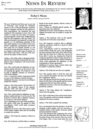 Cons: The PrepCom fails, beginning this review cycle with the admission that one state can stop the entire Treaty review process. The 2010 review cycle begins with a worse result than the 2005 review cycle did, at a time when the disarmament and non-proliferation regime is in crisis.