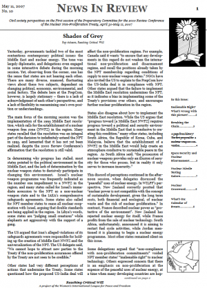 Non-nuclear weapon states called for assurances from the weapon states that nuclear weapons would not be used, or threatened to be used, against them. Since the inception of the Treaty, non-nuclear weapon states have sought these “negative security assurances” (NSAs), but the nuclear weapon states have been loathe to give them. The Non-Aligned Movement made its regular call for “universal, unconditional, legally-binding” NSAs, and nuclear weapon states again insisted that the assurances they have given in the past are sufficient. Many states discussed how security assurances could become part of the NPT package. States should determine the form of NSAs and their relationship to the Treaty in this review cycle. South Africa reminded states that the New Agenda Coalition submitted a working paper exploring these ideas to the 2003 PrepCom. Italy’s working paper suggests states do a survey of which states have security assurances now (via nuclear weapon free zone treaties) and which states could be eligible for such assurances.