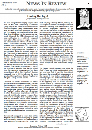 We have emerged on the slightly brighter other side of the first Preparatory Committee (PrepCom) in this review cycle of the nuclear Non-Proliferation Treaty. Governments managed to wrestle a qualified success out of a meeting that teetered on the edge of failure. After four days of fighting over the agenda, governments discussed the NPT, disarmament, and non-proliferation in a relatively congenial atmosphere. The conference adopted a consensus factual summary, but was not able to agree on the Chair’s Factual Summary, which was submitted as a working paper (WP 72). The summary Chair’s Paper contains a reference to a Nuclear Weapons Convention (introduced as a working paper during the session), support for the P6 proposal for a programme of work in the Conference on Disarmament, positive reference to the 1996 International Court of Justice Advisory Opinion, and more. Nuclear disarmament is officially back on the table, which was clear in substantive discussions, and the agenda for the next two PrepComs includes discussing previous disarmament commitments. During the PrepCom, it was also clear that the role of Non-Governmental Organizations has been strengthened; all of this PrepCom's debates remained open to NGOs, following the 2004 practice. States parties set the next PrepCom for 28 April – 9 May, 2008 in Geneva.