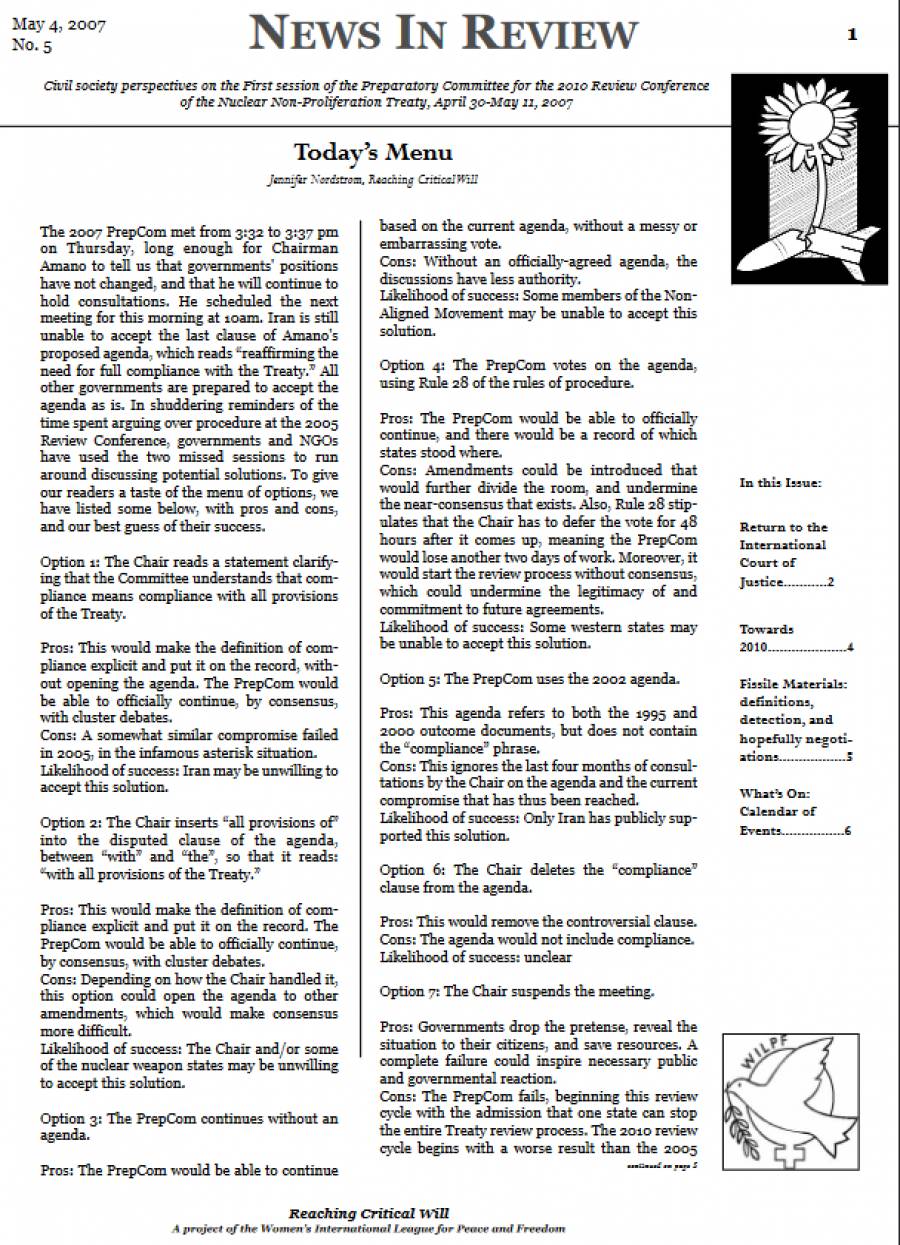 In the past, Canada has routinely called for standardized and consistent reporting pursuant to Step 12, while Brazil has recommended that the NPT bureau track measures that nuclear weapon states have taken to implement article VI of the Treaty. On Friday, Mexico’s representative called for a legally-binding mechanism for transparency and accountability that would include requirements for states to report not only on their reductions but also on their holdings and future plans. Canada’s delegate also wanted to hear reports on the operational status of nuclear weapons, as did Japan and New Zealand. Japan’s Amb. Tarui pointed to his delegation’s working paper on nuclear disarmament (WP.10), which includes a non-exhaustive list of possible categories for reporting (see Working Paper Review on page 7 for more information).