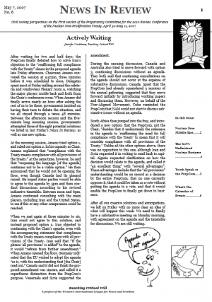 Most delegations recognize the connection between the peace process in the Middle East and the establishment of a nuclear weapon free zone (NWFZ) in the region. However, almost all states take the position that one has to happen before the other, which Greenpeace International Political Advisor Merav Datan described as a “chicken or the egg” dilemma, in a event organized by Greenpeace on the experience of campaigning for disarmament in Israel (see page 6). On Monday, many Arab delegations argued that the establishment of a NWFZ in the Middle East would, as the Egyptian delegate said, “advance the prospects of overall peace in the region.” He also argued it would “represent a practical attestation that destructive arms and weapons would no longer remain the guarantor of security.” China’s delegate agreed it would advance the peace process in the Middle East, by helping create a political atmosphere of trust and conciliation.