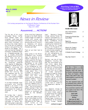 States parties to the Review Conference must, however, heed the demands of this massive outpouring of civil society support for the Treaty’s objectives. Kofi Annan, SecretaryGeneral of the United Nations, opened his remarks to the Conference by highlighting just a few of the catastrophes engendered by a nuclear attack: “Tens, if not hundreds, of thousands of people would perish in an instant, and many more would die from exposure to radiation…Carefully nurtured collective security mechanisms could be discredited. Hardwon freedoms and human rights could be compromised.” Tens of thousands of people marched in New York to prevent the exact type of scenario so hauntingly predicted by the SecretaryGeneral.