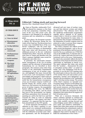 On Friday, 11 May the NPT PrepCom wrapped up its work with the adoption of its procedural report. Only one amendment was made to the draft report: paragraph 19 referring to the Chair’s factual summary was removed. The factual summary is now only listed in the report’s annex of working papers. This probably was done in an effort to preclude the unfortunate habit in other fora of heavily caveating chairs’ summaries with language suggesting it has no relevance to the proceedings of states parties.