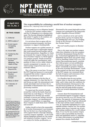 The Bulletin of Atomic Scientists, which maintains the clock, explained that one of the biggest reasons for moving the clock closer to midnight in 2012 was the lack of progress on nuclear disarmament. Over the last two days, many governments have expressed their disappointment and frustration with this lack of tangible progress on nuclear disarmament. The delegations of Brazil and Ireland argued that while the NPT’s non-proliferation provisions have successfully prevented acquisition of nuclear weapons, the treaty’s disarmament provision has not achieved its objective. “Never in history have such a great number of States renounced voluntarily having a specific weapon whereas a very few were entitled to keep them, albeit temporarily,” noted Ambassador Guerreiro of Brazil. But he expressed confidence that the nuclear weapon states “will sooner or later” realize that it is in their security interest to live in a world free of nuclear weapons.