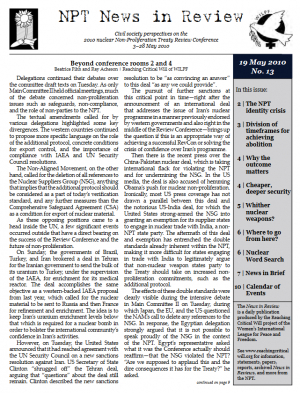 Action 6, which previously said the NWS “shall convene consultations not later than 2011 to accelerate concrete progress on nuclear disarmament,” now says that the NWS “are called upon to convene timely consultations.” The original document had NWS reporting back to NPT states parties in 2012; the new version calls on them to do it during the upcoming review cycle. Instead of the UN Secretary-General convening “an international conference in 2014 to consider ways and means to agree on a roadmap for the complete elimination of nuclear weapons within a specified timeframe, including by means of a universal, legal instrument,” the UNSG is now invited to convene “an open-ended high-level meeting to take stock and agree on a roadmap for the complete elimination of nuclear weapons, including by means of a universal, legal instrument.”