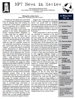 Friday saw the release of three new texts: the Subsidiary Body I draft action plan on nuclear disarmament; the Subsidiary Body II text on regional issues, including actions for implementing the 1995 resolution on the Middle East; and the second Main Committee III draft chair’s report. Delegations discussed the latest MCI, MCII, and MCIII texts throughout the day in the relevant committees. It became clear that while there is generally more agreement over the texts than there was a week ago, delegations have still not reached consensus. Open discussions were not held on the subsidiary body texts introduced on Friday, but both provide insights into the status of the closed deliberations.