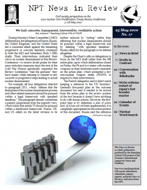 When the afternoon closed meeting kicked off at 4:00 PM, delegations engaged in a section-by-section review of the document, making comments, suggesting changes, and identifying areas where consensus still has not been reached. These areas are roughly the same as the beginning of the Conference, and include such controversial topics as the action plan on disarmament, the IAEA safeguards system and its additional protocol, export controls, and non-compliance. In addition to these, the issue of a nuclear weapons free zone in the Middle East hangs over the Conference like the sword of Damocles with no official reactions to the draft proposed by Ambassador Kelly last week.