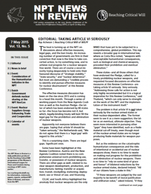 These states—and all those others that have endorsed the Pledge, called for a treaty prohibiting nuclear weapons, and requested focused discussions on effective measures at this Review Conference—are taking article VI seriously. Very seriously. “Addressing those calls for action is not only highly recommended but it is a logical imperative for this Review Conference,” said Thailand, “which can only serve to strengthen the work of the NPT and the implementation of the instrument itself.”