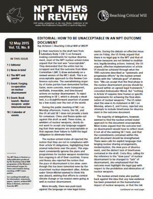 It is clear that, as in 2010, the nuclear-armed states will reject anything resembling an effective measure for nuclear disarmament in the NPT outcome document. Thus non-nuclear-armed states that are truly committed to achieving a nuclear weapon free world must consider how best to reach that goal in this context.