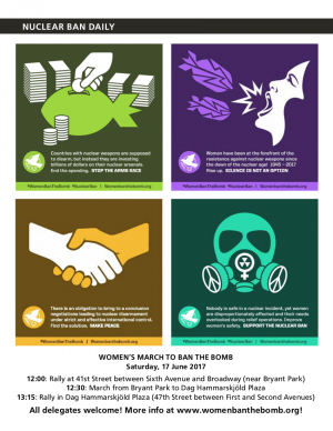 It’s game on for round two of the nuclear ban negotiations! Delegations from governments, civil society, and international organisations are rallying in New York City at the United Nations to start deliberating over the President’s draft treaty text—and to start crafting one of the most ambitious piece of international law ever attempted. People from around the world are also preparing to rally outside of the UN building, and in their home cities, in two days in support of these talks. The Women’s March to Ban the Bomb will see actions in Australia, Cameroon, Canada, Denmark, Germany, Italy, Japan, New Zealand, the Philippines, the United Kingdom, and the United States! The world is watching: it’s time to ban the bomb.