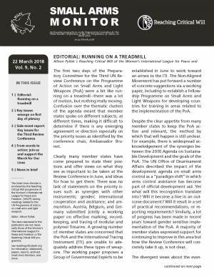 The first two days of the Preparatory Committee for the Third UN Review Conference on the Programme of Action on Small Arms and Light Weapons (PoA) were a bit like running on a treadmill—there was a lot of motion, but nothing really moving. Confusion over the thematic clusters of the agenda meant that member states spoke on different subjects, at different times, making it difficult to determine if there is any emerging agreement or direction especially on the priority issues as identified by the conference chair, Ambassador Brunet.